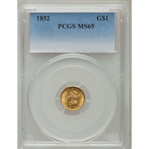 Celebrating the California gold rush, the $1 Liberty Gold Coin Type I MS-65, minted from 1849-1854, showcases the U.S. Mint’s exceptional craftsmanship. This coin’s MS-65 grade from NGC or PCGS makes it a highly sought-after piece, containing .0483 oz of Gold. Its design of Liberty on the obverse and a detailed wreath on the reverse reflects the optimism and growth of the era.