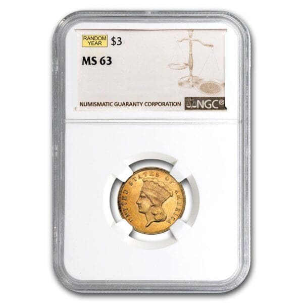 The MS-63 $3 Gold Princess, minted between 1854 and 1889 and certified by NGC or PCGS, is a rare and valuable addition to any collection. This coin, with its .1451 oz of Gold, showcases the Indian Princess design, reflecting a period of American history filled with innovation and change.